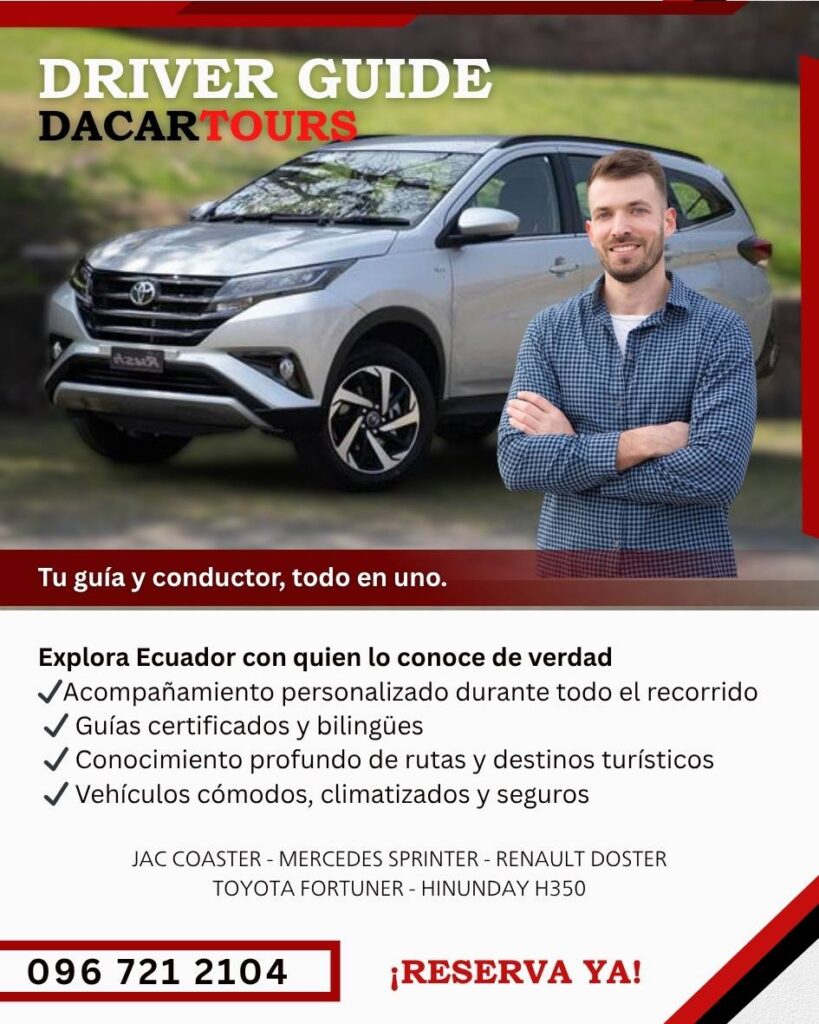 En Dacartours ofrecemos el servicio de Driver Guide, una solución ideal para quienes desean recorrer el Ecuador con total comodidad, acompañados de un conductor-guía bilingüe y certificado por el Ministerio de Turismo.